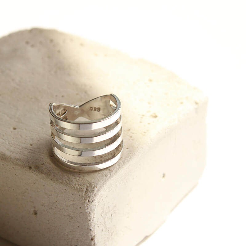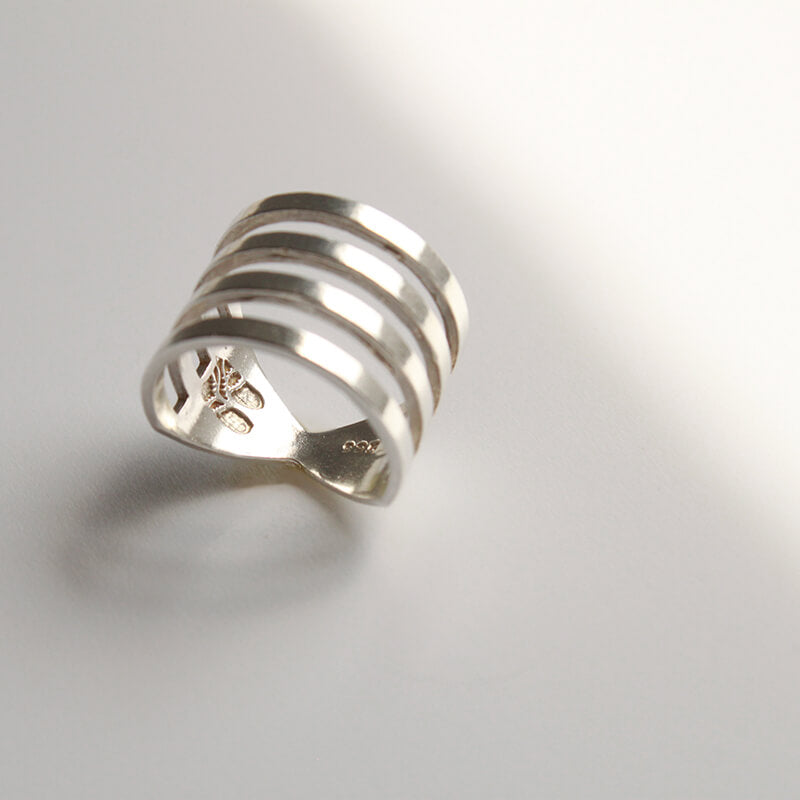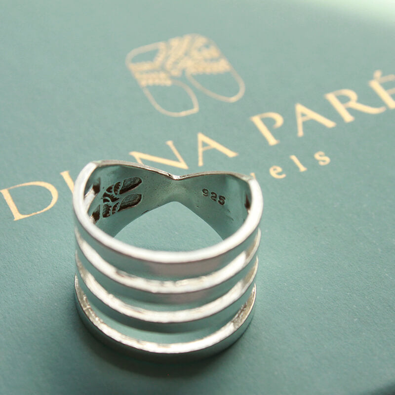 Hecho en Plata maciza de ley 925 por fundición, pulido y terminado a mano en nuestro taller en Barcelona. Logo de Diana Parés y sello de golpe 925 grabado en la parte interna del anillo.