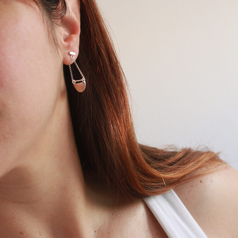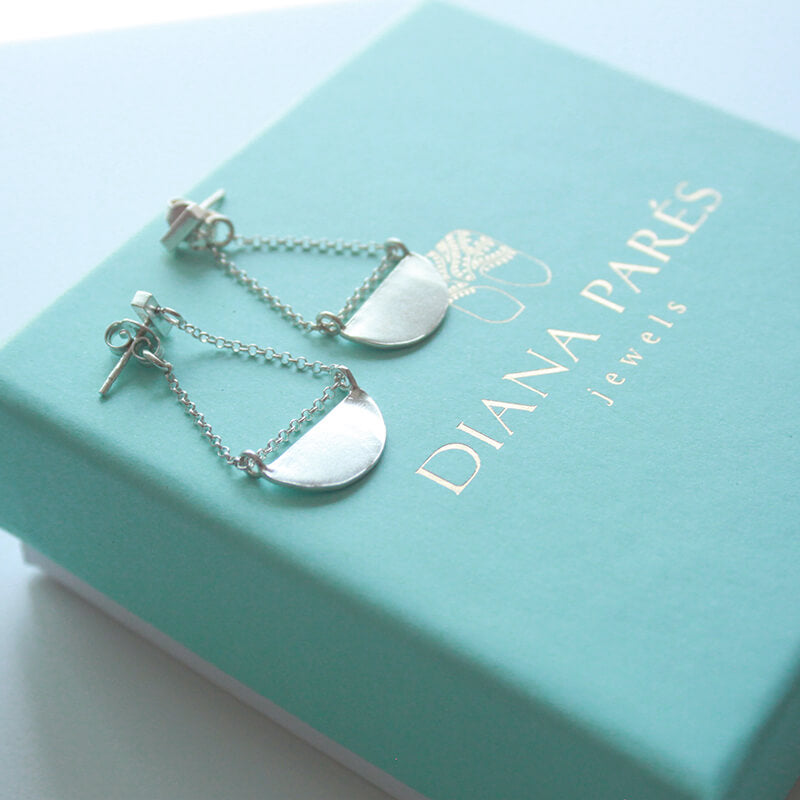 Hechos en Plata de ley (925). Calados y pulidos totalmente a mano cuidando cada detalle, en nuestro taller en Barcelona. Firma de Diana Parés 925 con letra de golpe en el lateral de un pendiente.