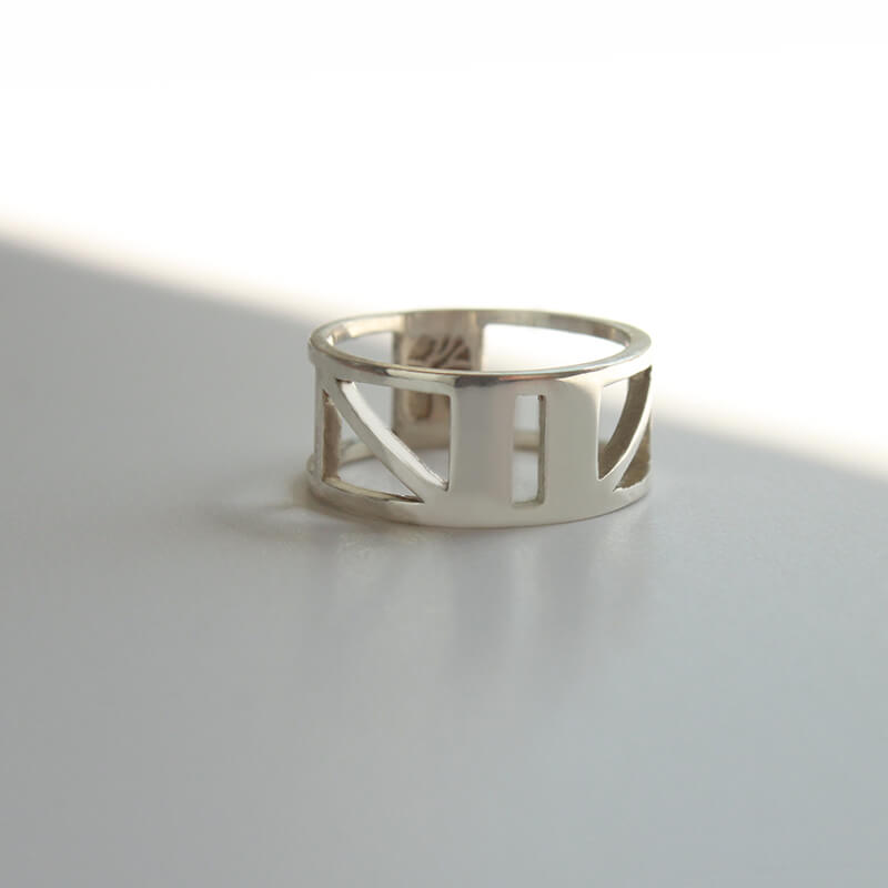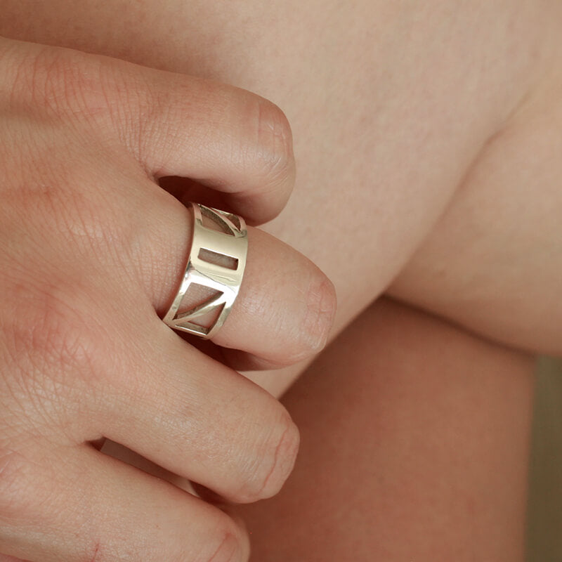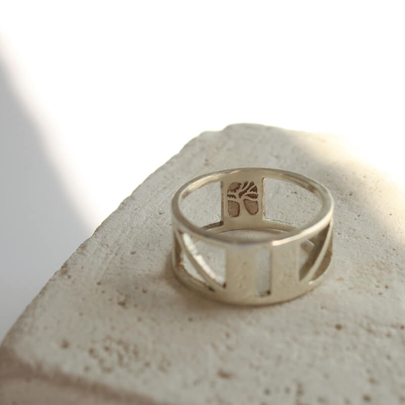 Hecho en Plata maciza de ley 925 por fundición, pulido y terminado a mano en nuestro taller en Barcelona. Logo de Diana Parés y sello de golpe 925 grabado en la parte interna del anillo.