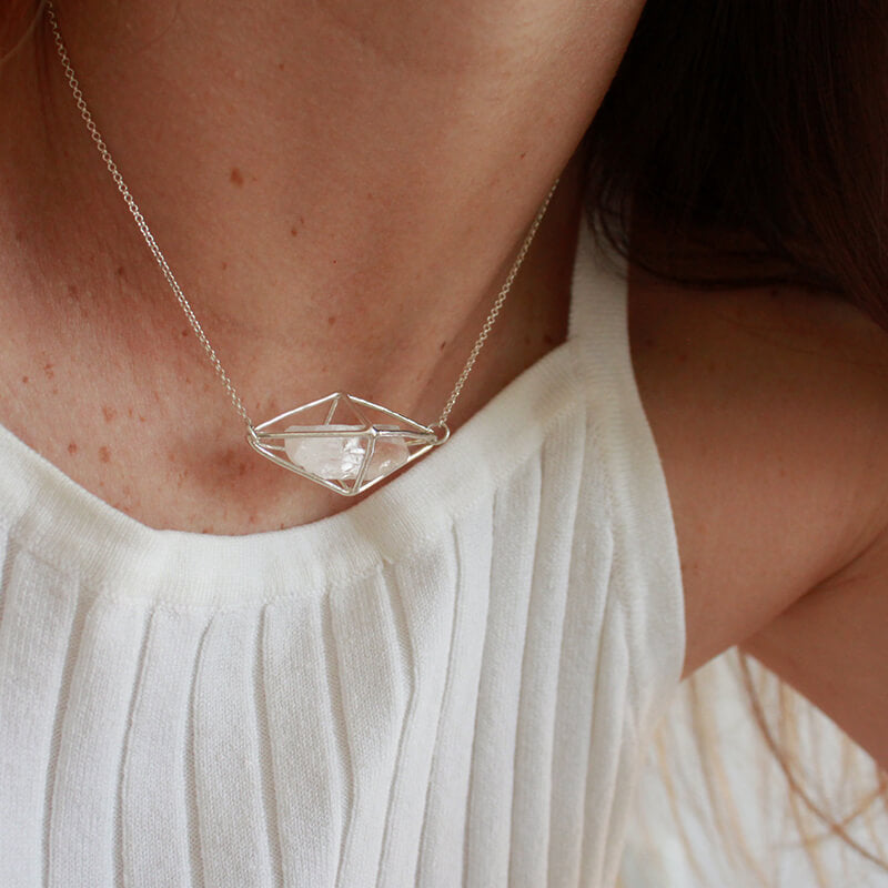 Un diseño único de joyería contemporánea, muy moderno y original. De concepto geométrico en volumen, encierra en perfecto balance de tamaños, un trozo de mineral con libre movimiento.