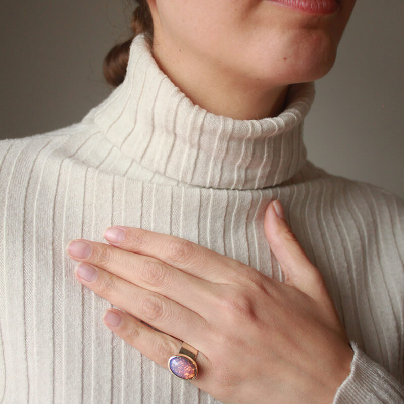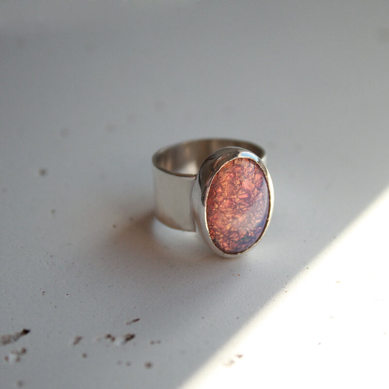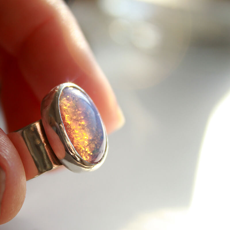 Hecho a mano en Plata maciza de ley 925, pulido y terminado a mano en nuestro taller en Barcelona. Sello de golpe Diana Parés 925 grabados en la parte interna del anillo. Cabujón de Ópalo sintético