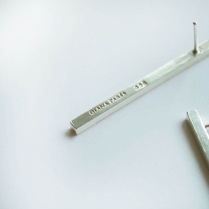 Hechos en Plata de ley (925). Calados y pulidos totalmente a mano cuidando cada detalle, en nuestro taller en Barcelona. Firma de Diana Parés 925 con letra de golpe en el lateral de un pendiente.